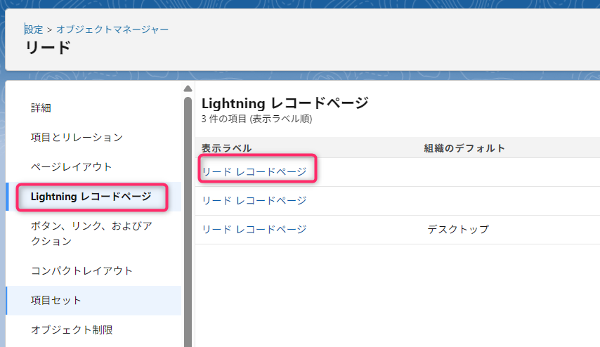 2. オブジェクトの設定画面にて、「Lightningレコードページ」を選択し、開きたいLightningレコードページをクリック。
