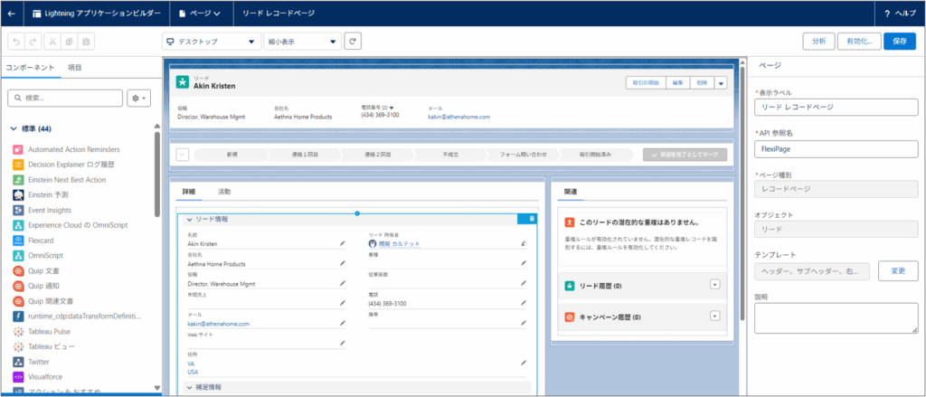 2. Lightningアプリケーションビルダーが起動し、そのオブジェクトに紐づく既存のLightningページが表示されます。
