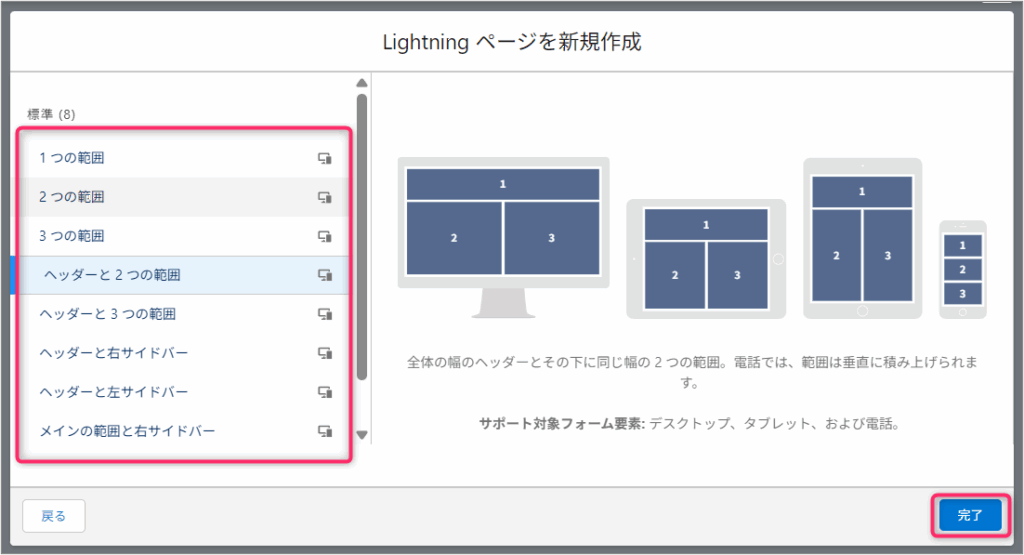3.レイアウトを選択して完了をクリックします。こちらもあとから変更可能です。