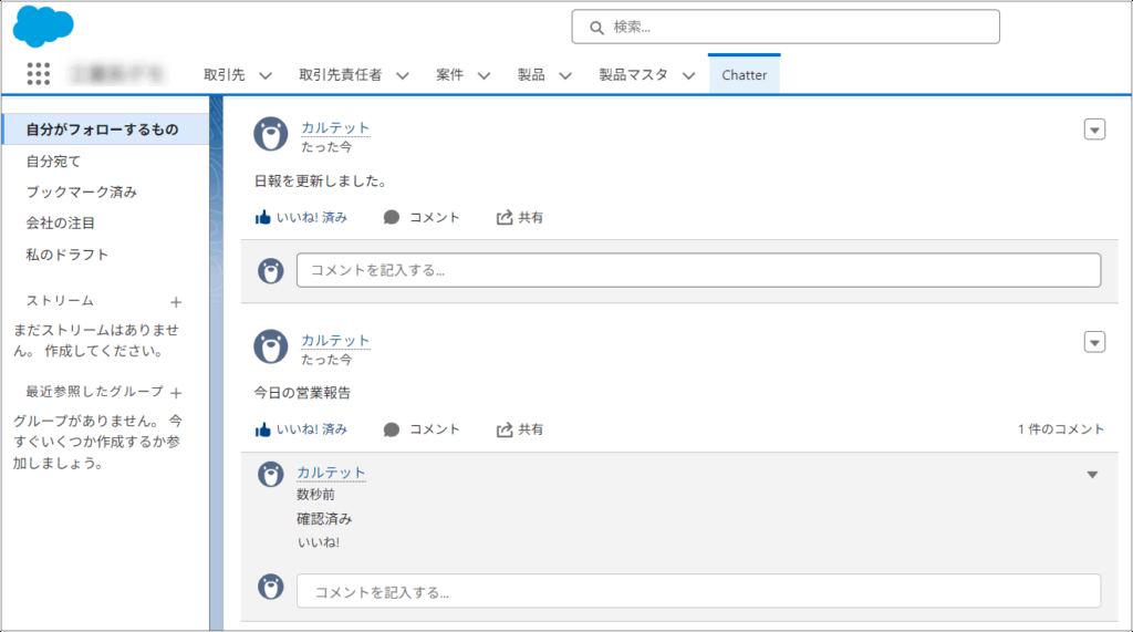 Chatterは、Salesforceに標準搭載されている社内向けSNS機能です。