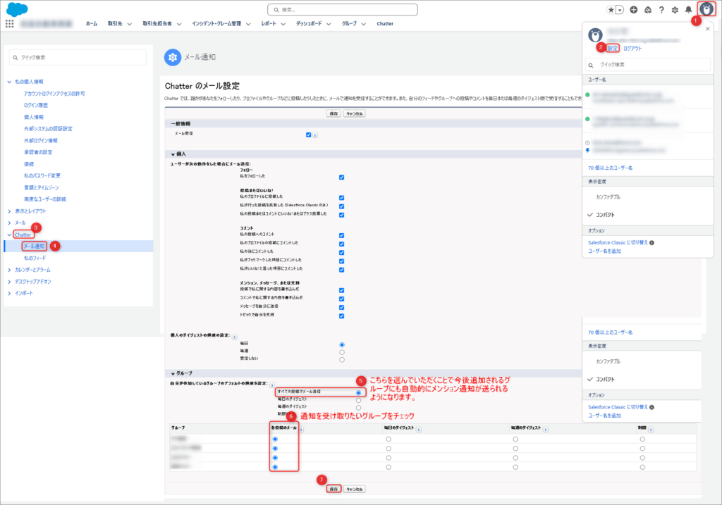 Chatterグループの投稿通知をメールで受け取るには、以下の設定が必要です。
