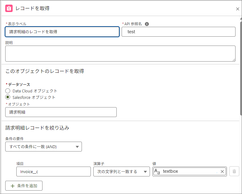 - 「レコードを取得」で更新が必要な請求レコードを取得します。
