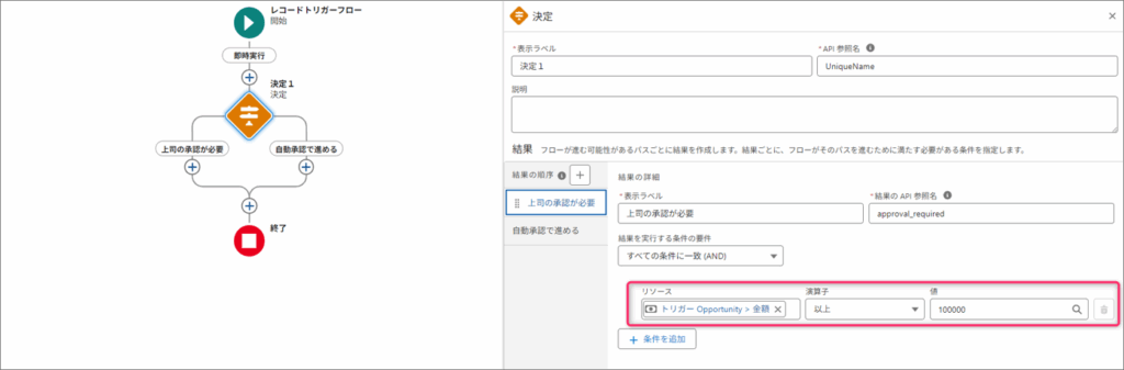 「金額 ≧ 100,000」という条件を設定すれば、次の処理を2パターンに分けることができます。