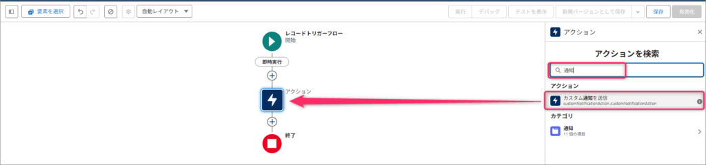 「+」から「アクション」を選び、「カスタム通知」、「メール送信」または「Slack通知(外部連携)」を指定します。