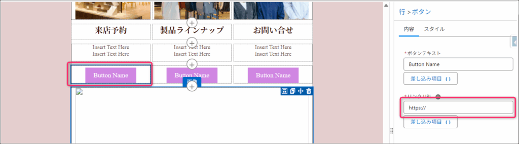 メールエディタでリンクを挿入したいテキストやボタンに、コピーしたURLを設定します。