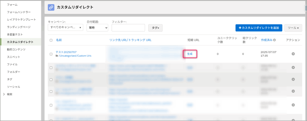「カスタムリダイレクトを作成」ボタンをクリックしてリンクを作成します。