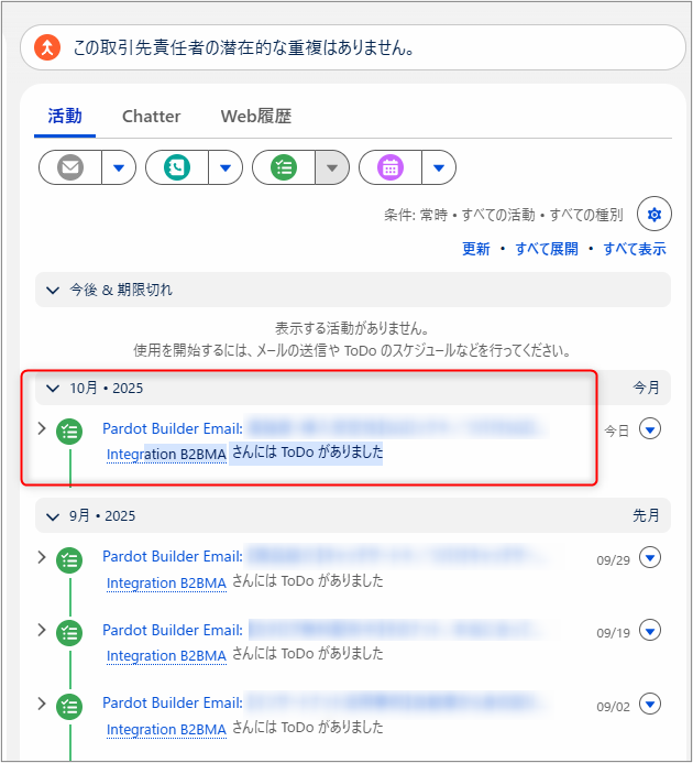 Salesforceの取引先責任者やリードの活動履歴を見ると、 「Pardot Builder Email: ○○○」という件名の完了ToDoがずらっと並んでいることがあります。(下の画像のイメージ)