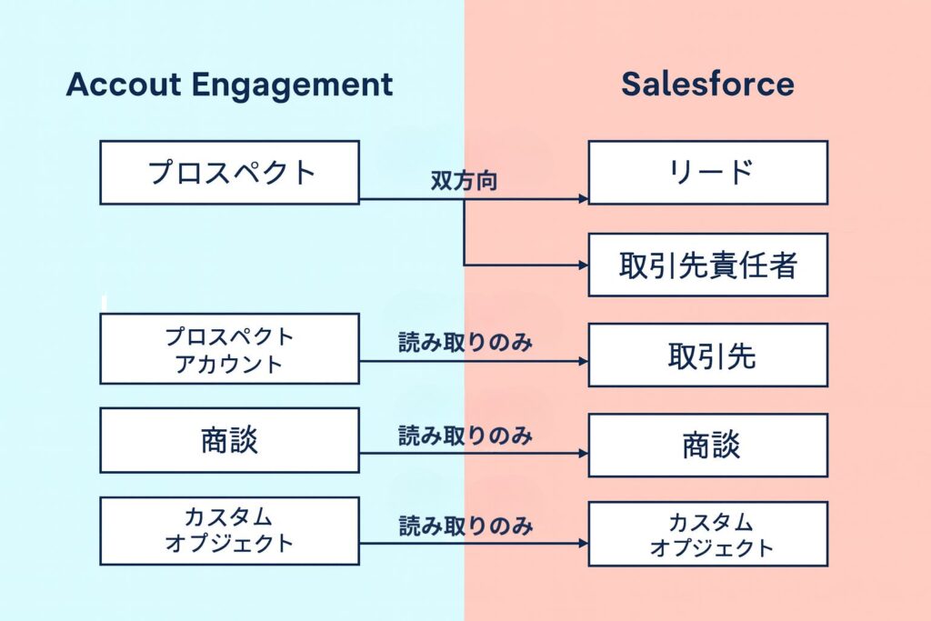 その他のオブジェクトについては、Salesforce → Account Engagementの読み取りのみとなります。