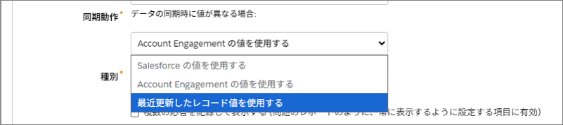 Account EngagementとSalesforceで同じ項目を同期する際には、どちらのシステムの値を優先するかを設定する必要があります。