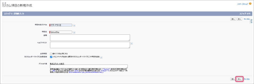 同期動作の設定は、Account Engagement側のカスタム項目作成時または編集時に指定可能。