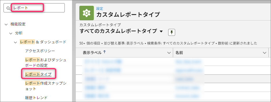 - 該当オブジェクトやフィールドが含まれているかどうかをレポートタイプ設定画面でチェック