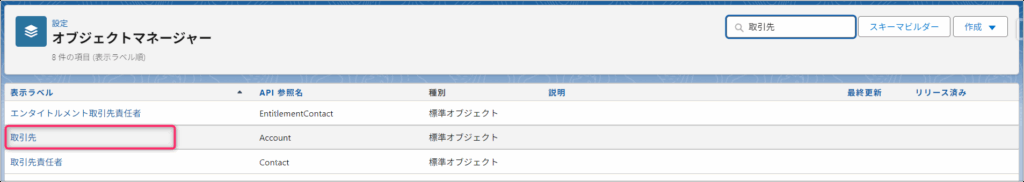 Salesforceの設定画面から、「取引先」や「商談」など、対象とするオブジェクトを選択します。