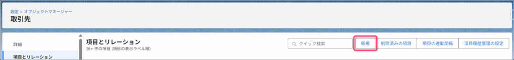 「項目とリレーション」セクションに入り、「新規」ボタンをクリックして新しいカスタム項目を作成します。