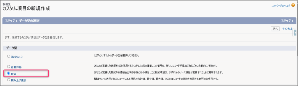 項目タイプは「数式」を選択し、戻り値のデータ型は「数値(整数)」を指定。