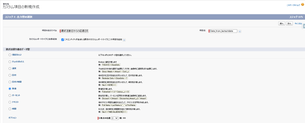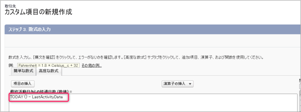 この式では、最終活動日に日付が入っていない場合は、レコードの作成日からの経過日数が数値として取得できるようになっています。