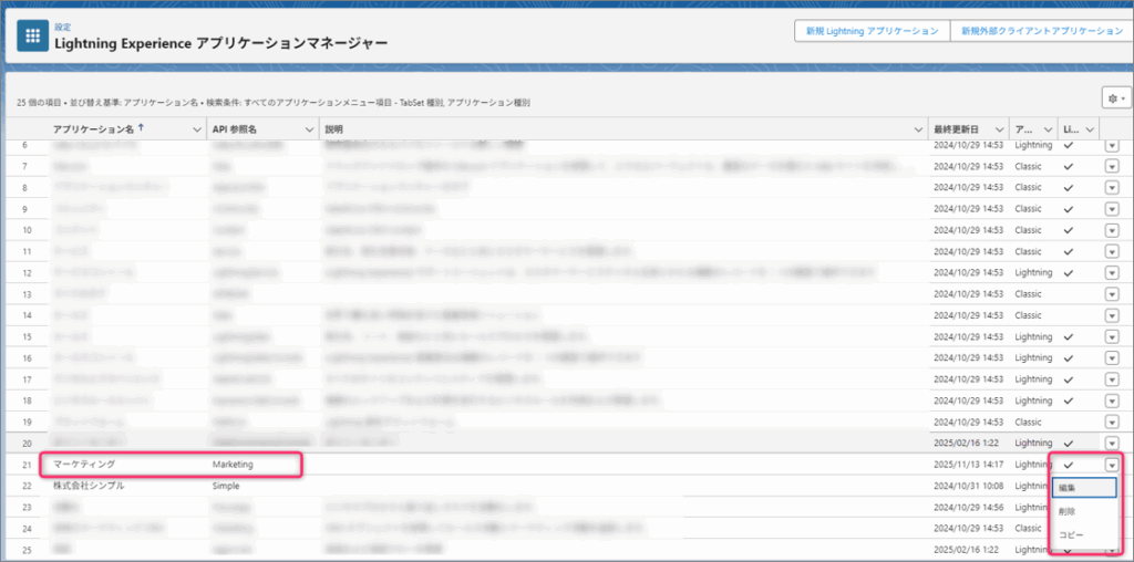 編集したいアプリケーションの行にあるメニューから「編集」をクリックします。