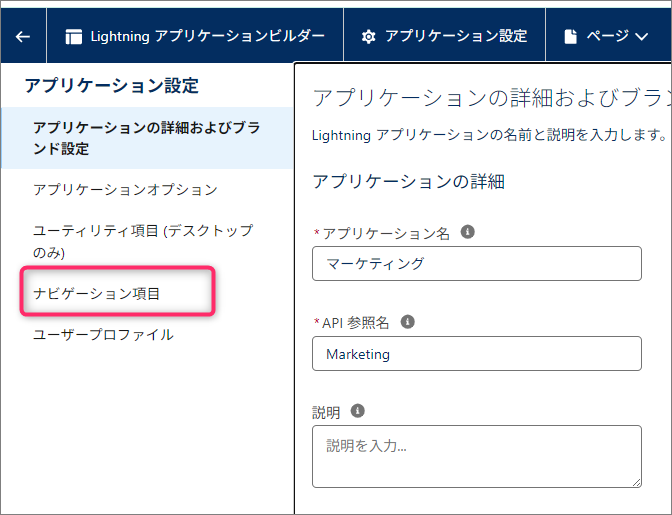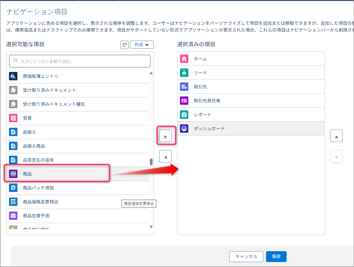 アプリの編集画面で、「ナビゲーション項目」を選択し、利用可能なタブ(オブジェクト)から目的の項目を追加します。