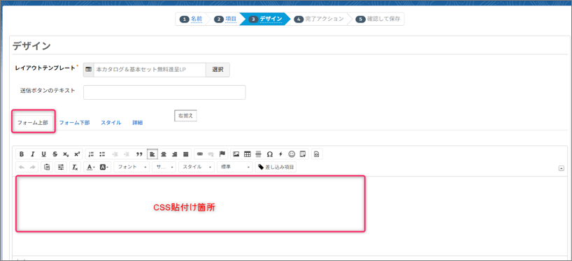 ② 指定されたCSSコードをフォームの上部に挿入します(案件ごとに異なるため多少の編集は必要になります)。