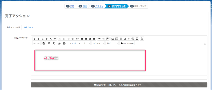 ① フォーム送信後の「お礼メッセージ」を設定します。