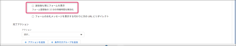 ② 「送信後も常にフォームを表示」にチェックを入れることで、完了後もフォームが表示されたままになります。