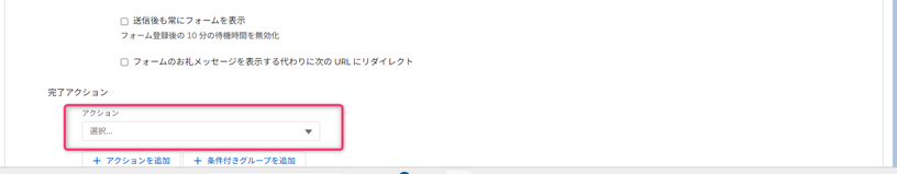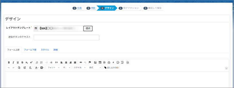 ① フォームの構築が完了したら、見た目の調整と、送信後に実行される処理(完了アクション)を設定します。