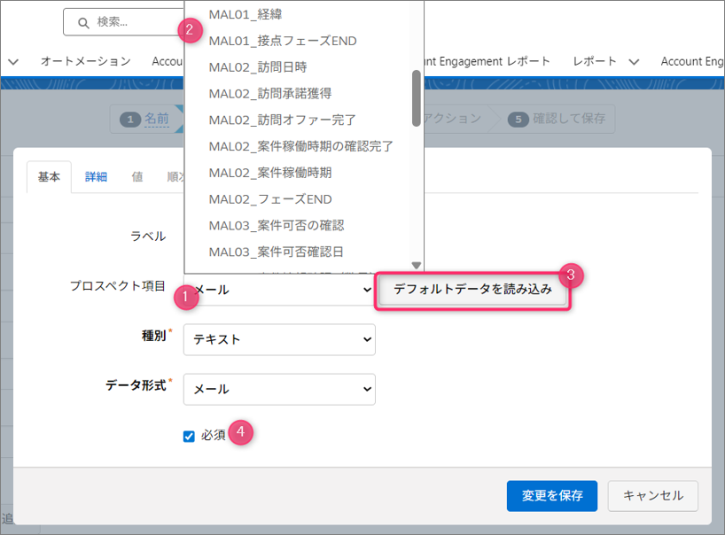 ① フォームで使用する項目を、既存のプロスペクト項目(例:アンケートナンバー1)と紐付けて設定します。ラベルの編集や既定値の読み込み、必須チェックの有無を確認しながら設定します。