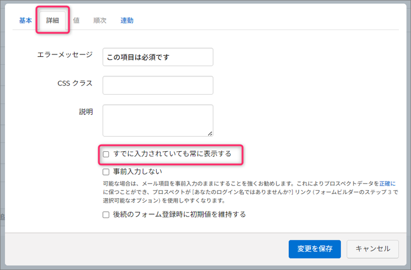 - 「すでに入力されていても常に表示する」にチェックを入れることで、ユーザーの入力内容を確認・修正しやすくなります。