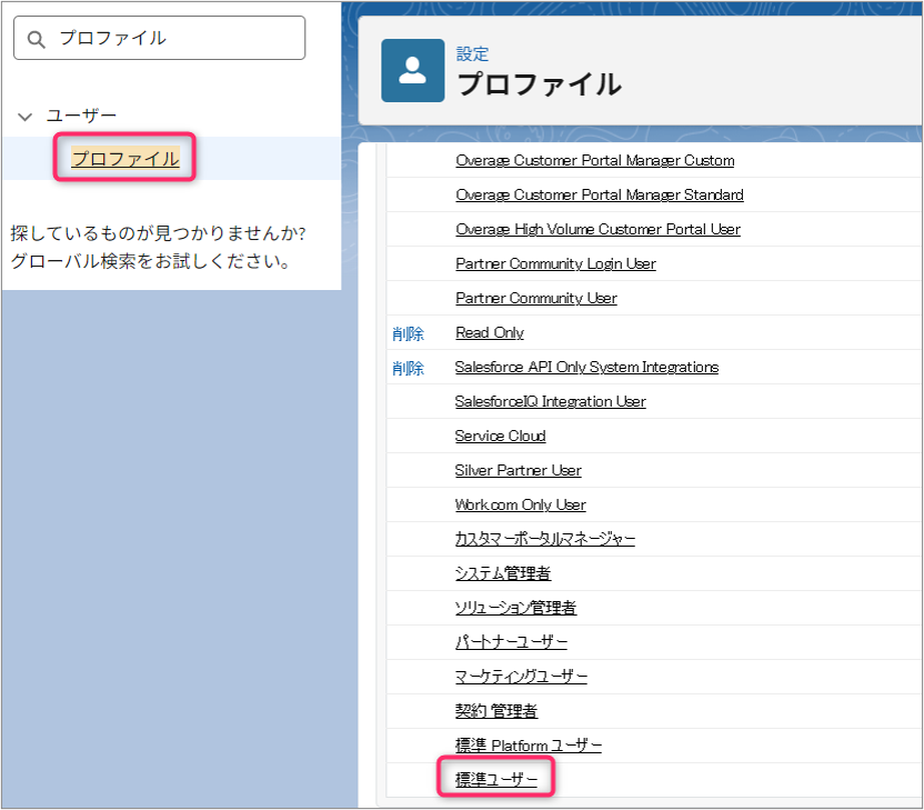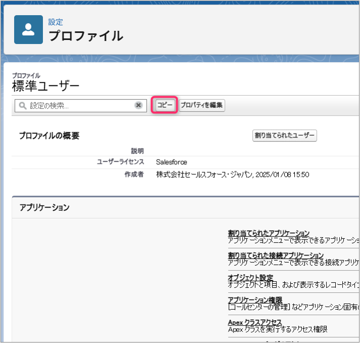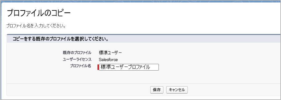 まずは、Salesforceが提供する「標準ユーザー」プロファイルをコピーして、カスタムプロファイルのベースを作成します。