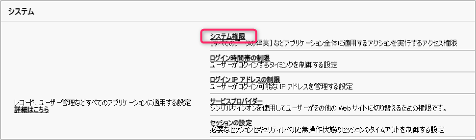 どのような権限が付与されているのかについては、システム権限、オブジェクト設定など、更に深い階層をチェックすることで確認できます。