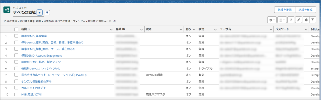 ・本番環境、Sandbox、開発環境を一覧で確認・管理できる。