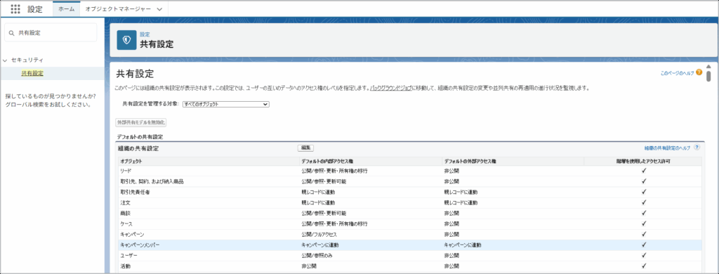 オブジェクト(取引先、商談など)ごとに、組織内のユーザーが「公開/参照のみ/非公開」のいずれかのアクセス権を持つかを設定します。