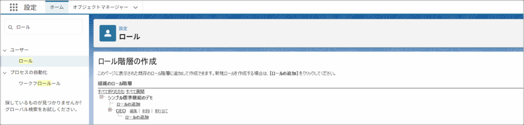 組織内のユーザーの役割に基づいた階層構造です。上位のロールに所属するユーザーは、原則として下位のロールに所属するユーザーが所有するすべてのレコードにアクセスできます。