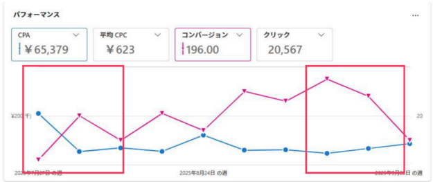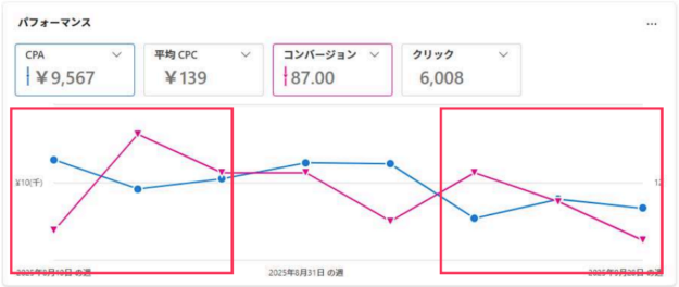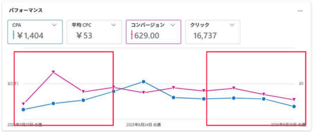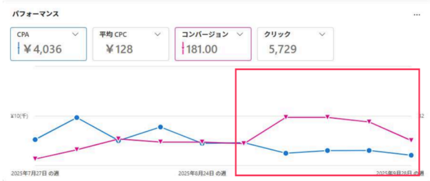 そこで、Google広告と同様の構成でMicrosoft広告を導入しました。その結果、初週こそCPA13,000円程度でしたが、機械学習が進むにつれて数値が急速に改善。最終的にCPA6,600円まで低下し、期間全体でもCPA9,500円台と、Google広告比で約30%のコスト削減に成功しました。