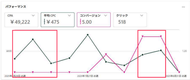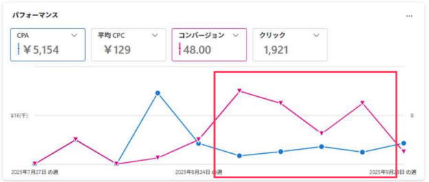 その結果、開始当初こそCPAが1万円程度まで高騰する場面もありましたが、1ヶ月が経過する頃には自動学習が最適化され、急速にCV数の増加とCPAの抑制が進みました。