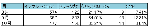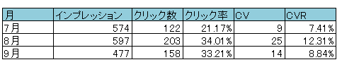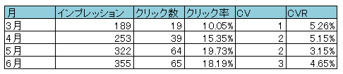 下の表は上記アカウントの指名キャンペーンの月別推移です。